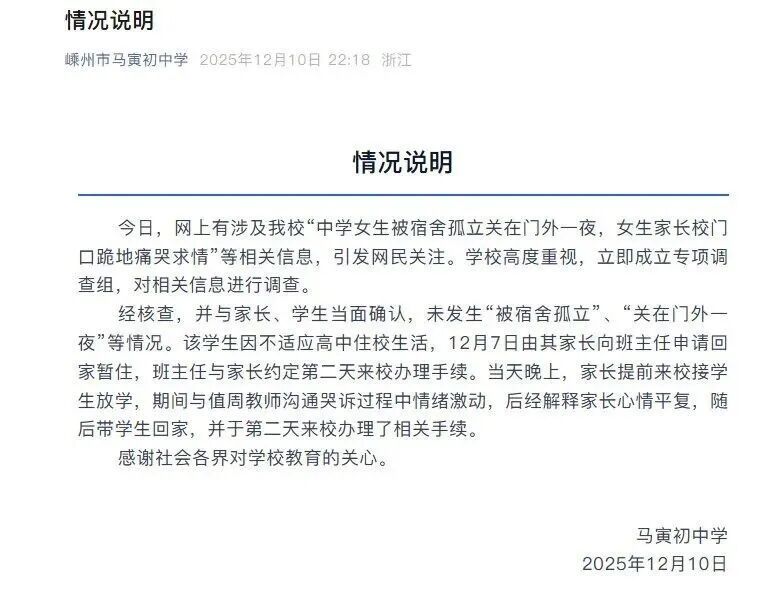 12月10日晚,浙江嵊州市马寅初中学发布情况证明: