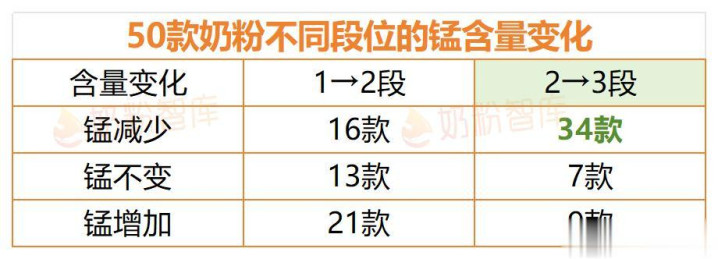 大部分奶粉从2段到3段的锰含量减少,主如果因为锰在3段为非必需身分。