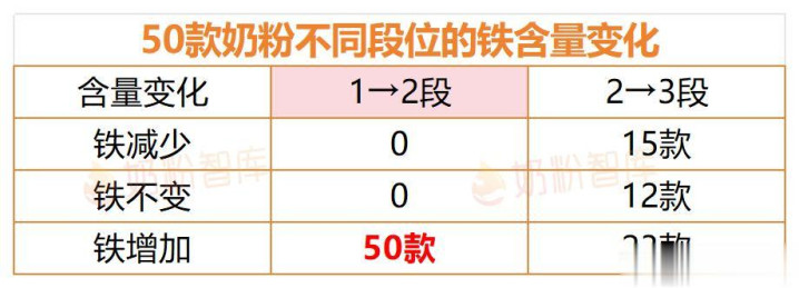 具体来看,所有奶粉从1段到2段中的铁含量增加。这是因为宝宝建树后体内储备有300mg附近的铁,然则在建树4~6个月后,储备铁险些被花消完,需要进一步增加铁元素的补充。